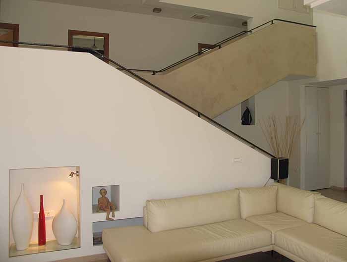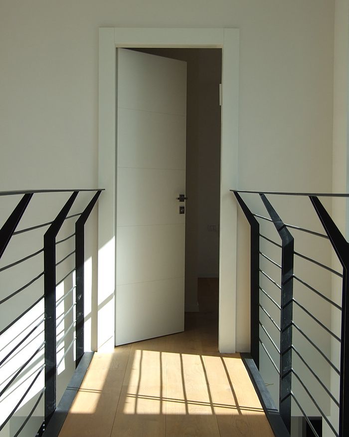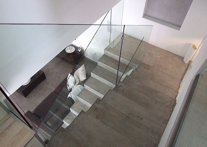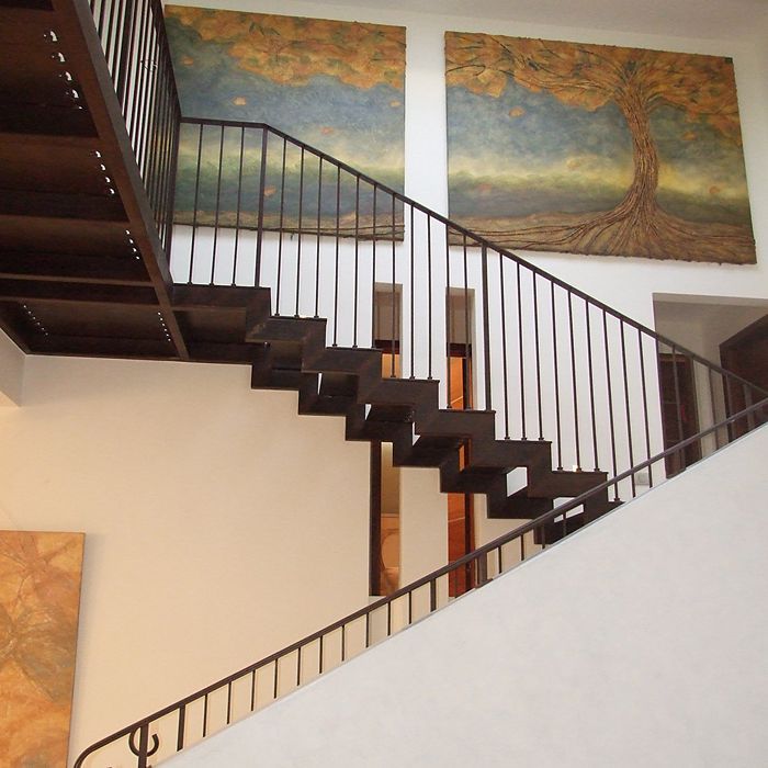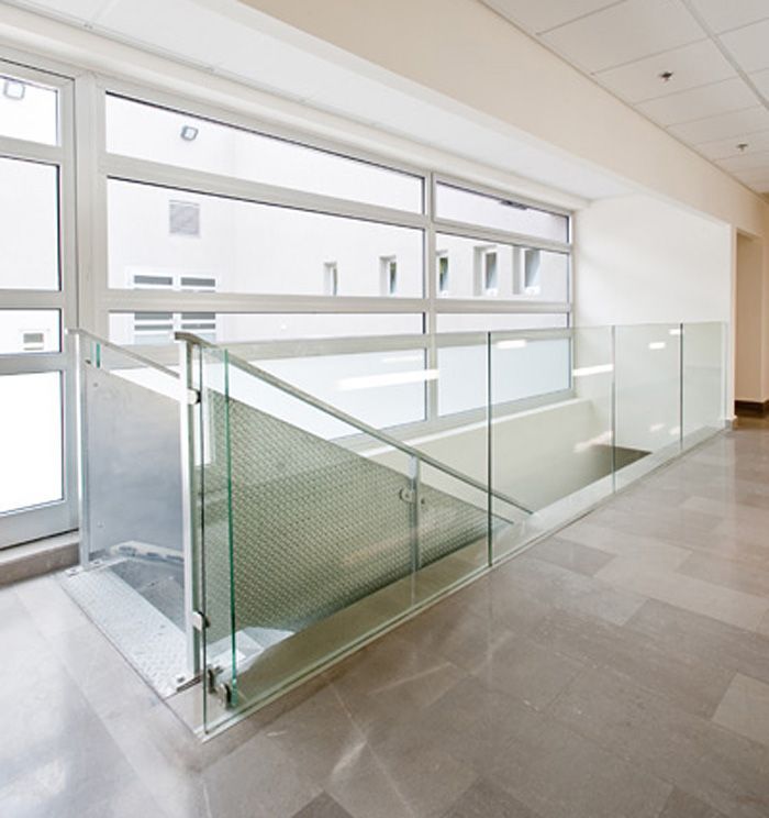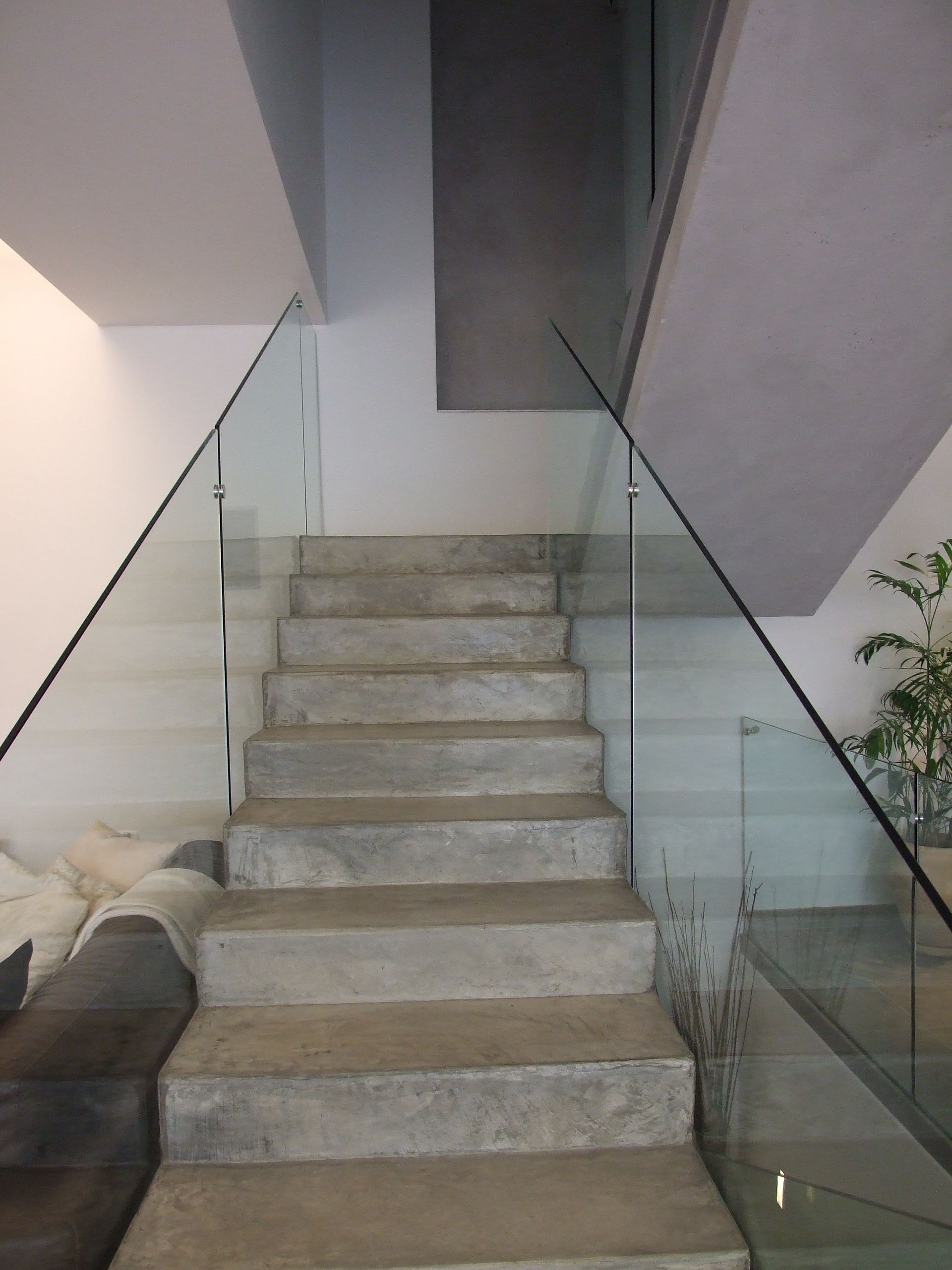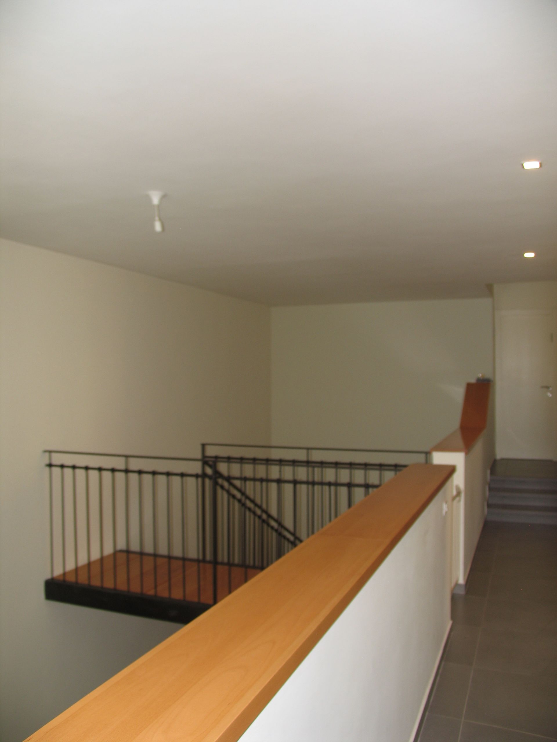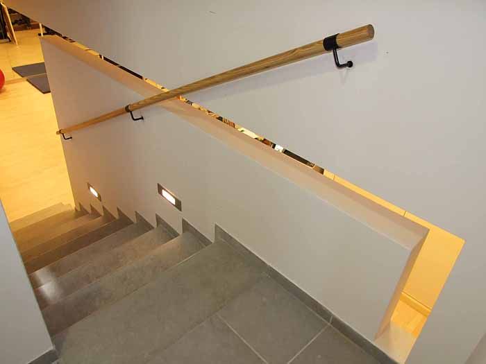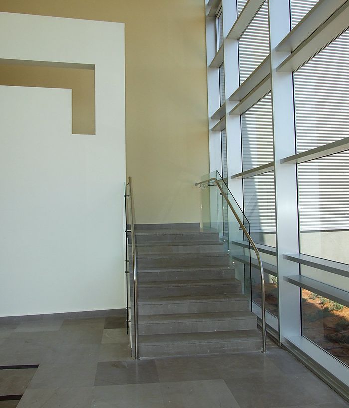 Buttonמדרגות קלות המתחברות למסדרון עם מעקה בנוי.